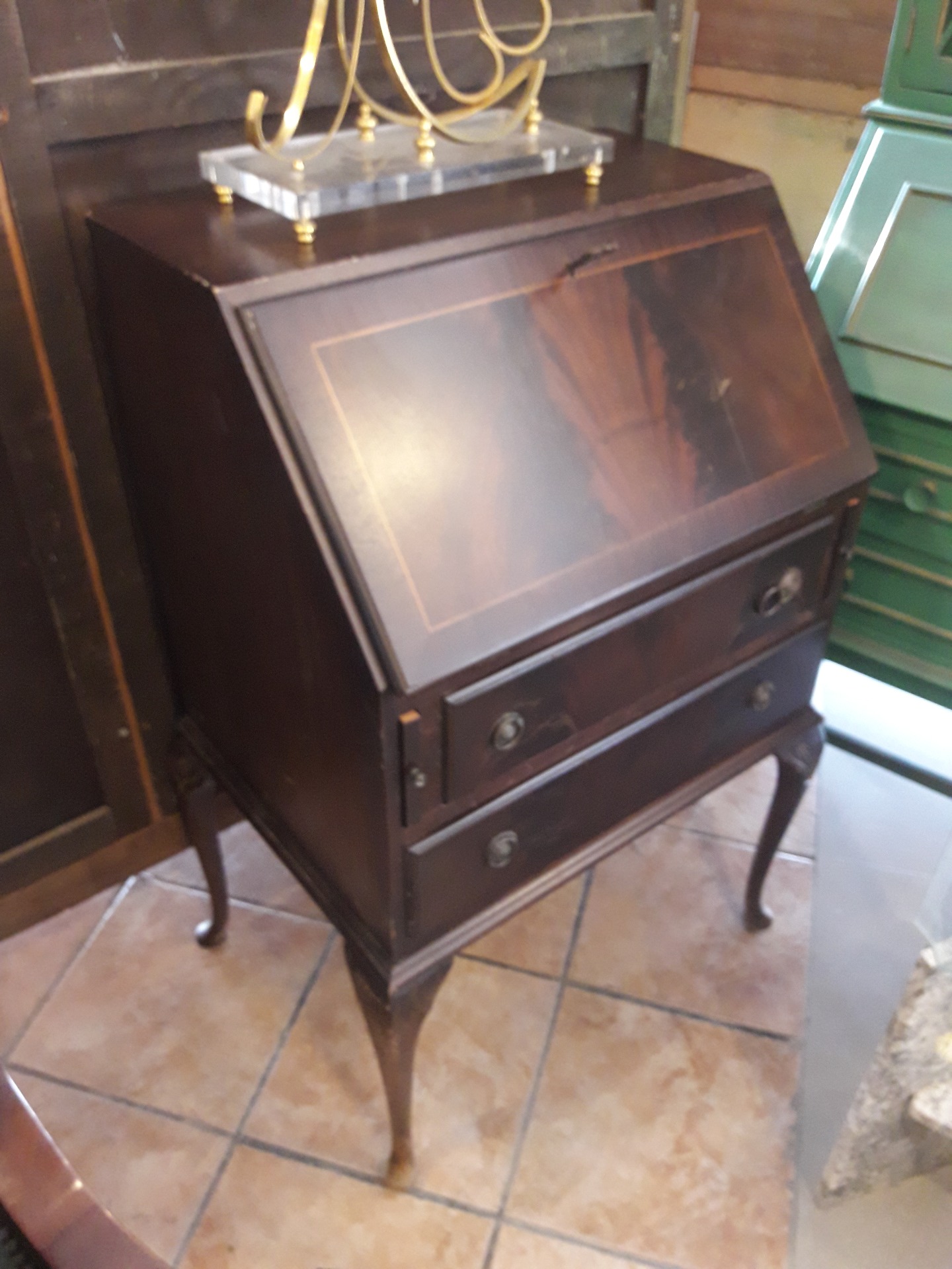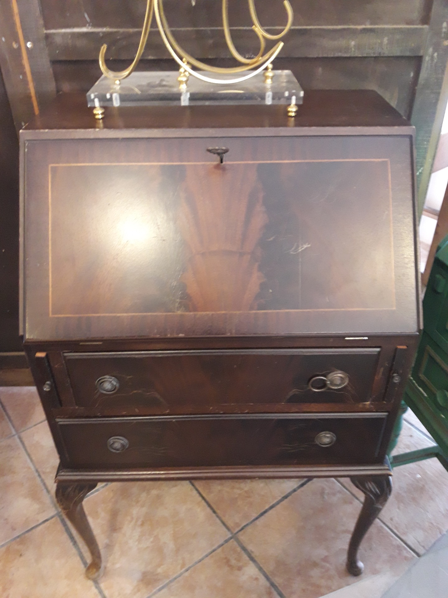 Secreter estilo ingles de tamaño mediano en madera color castaño con piel y tres cajones en la parte inferior.